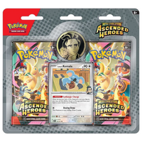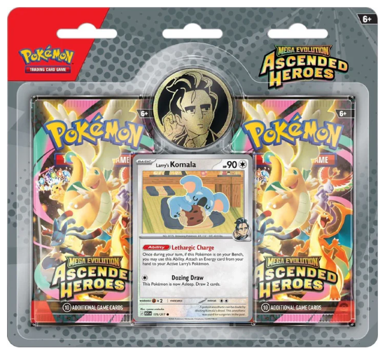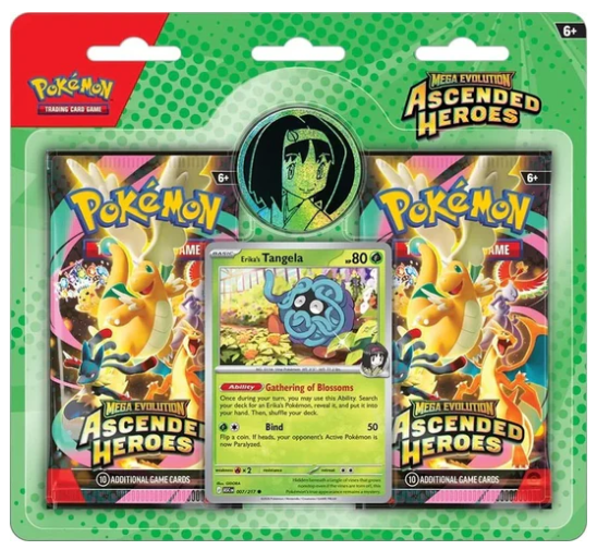 In this collection, you’ll find a promo card featuring either Erika’s Tangela or Larry’s Komala, a metallic coin featuring your chosen Gym Leader, and two booster packs from the special Mega Evolution—Ascended Heroes expansion.