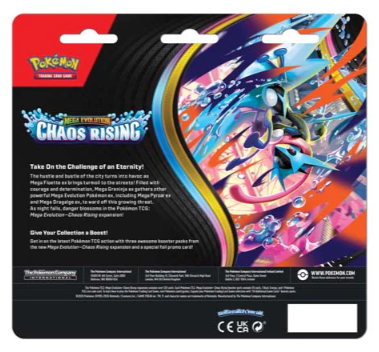 The hustle and bustle of the city turns into havoc as Mega Floette ex brings turmoil to the streets! Filled with courage and determination, Mega Greninja ex gathers other powerful Mega Evolution Pokémon ex, including Mega Pyroar ex and Mega Dragalge ex, to ward off this growing threat. As night falls, danger blossoms in the Pokémon TCG: Mega Evolution—Chaos Rising expansion!
