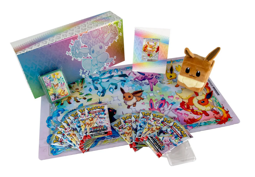 Eevee and its Evolutions spread friendship and joy everywhere they go, and with the adorable accessories in this collection, they’re sure to bring that same happiness to your next big game! Inside, you’ll find a special illustration rare-style promo card featuring Eevee as a Stellar Tera Pokémon ex, ready to evolve thanks to its Rainbow DNA. You also get a fuzzy Eevee deck box, a playmat and full set of card sleeves featuring amazing artwork of Eevee and its Evolutions, and more than a dozen booster packs from the special Scarlet & Violet—Prismatic Evolutions expansion.