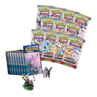 The Sun Pokemon and Moonlight Pokemon combine powers to bring dazzling treasures to your collection! Appearing as Stellar Tera Pokemon ex, Espeon and Umbreon sparkle brightly with attacks that disrupt your opponent’s strategy. These etched foil promo cards are joined by a display-ready figure showing both of these Eevee Evolutions looking focused and fierce, plus a collectible enamel pin and full set of card sleeves for your next deck. Then, get ready to find even more surprises inside booster packs from the special Scarlet & Violet—Prismatic Evolutions expansion!